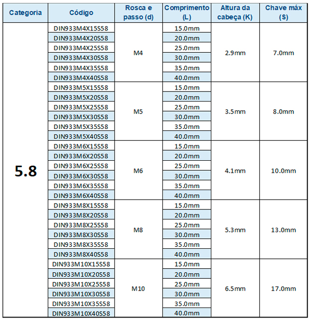 Produzido em aço carbono classe 5.8, é indicado para aplicações gerais que não exigem alto esforço mecânico.