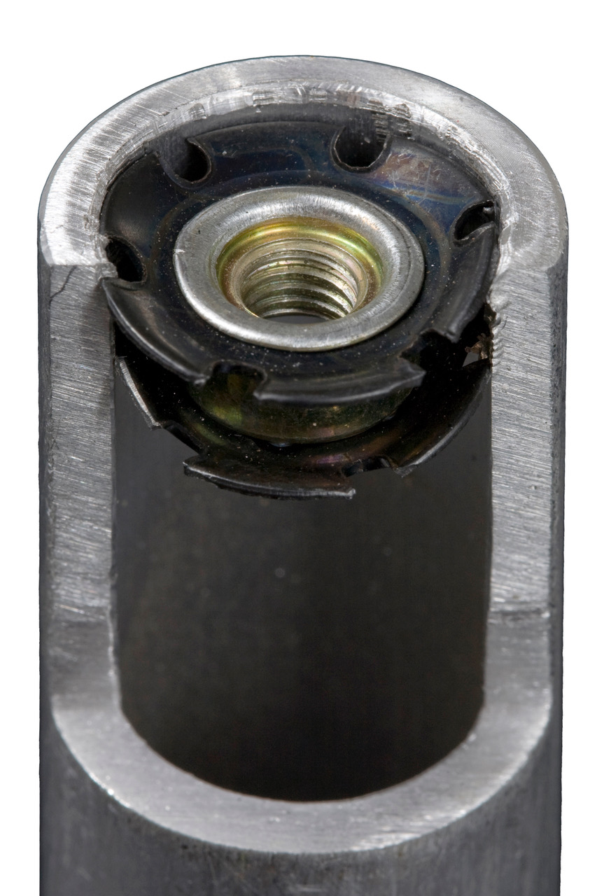 A porca tubo é a solução inovadora para posicionar uma porca dentro do tubo no sentido longitudinal e deixar a rosca sempre centralizada. As aletas feitas de aço mola cravam na parede do tubo, impedindo que ocorra o movimento de volta (tipo espinha de peixe).